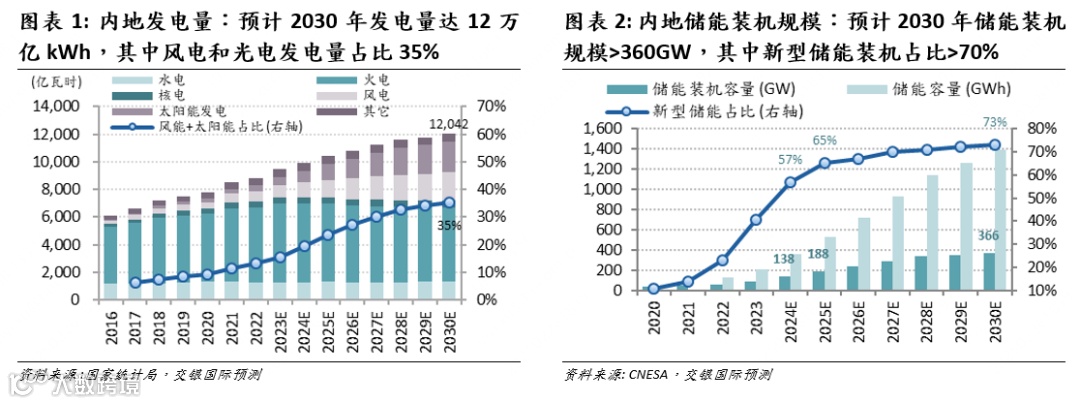 新能源具有随机性、间歇性与波动性,导致利用率偏低。因此,配储成为解决这一问题的重要途径。传统的抽水蓄能建设周期长、且受资源限制,难以满足未来电网储能需求,迫切需要发展新型储能技术。我们预计2025/2030年内地仅风电和太阳能发电量合计占比将达到23%/35%,储能装机规模也有望随之提升至188/366GW,其中,新型储能装机占比接近65%/73%(2024年:57%)。