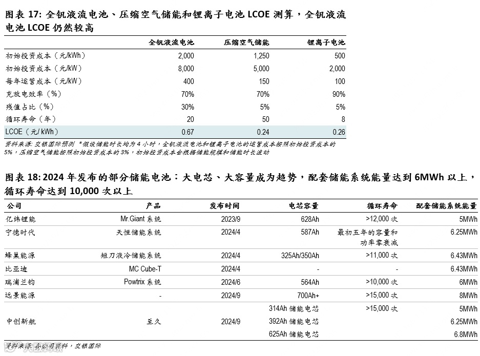 从技术成熟度看,锂离子电池在产业配套上大幅领先其他新型储能。技术方面,314Ah大容量锂电池储能电芯的渗透率已超40%,各家锂电企业正在研发更大容量的储能系统,未来将向着600Ah迈进,配套储能系统能量达到6MWh以上。循环寿命方面,最新发布的锂离子储能产品理论上可以做到10,000次以上循环。因此我们预计短期内电池储能仍将是新型储能的主流。