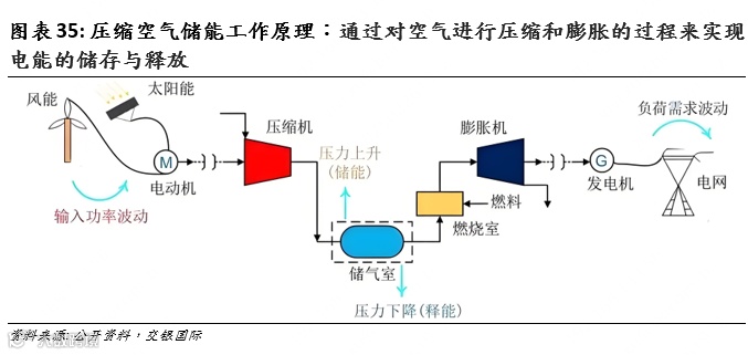 压缩空气储能的工作原理是基于空气的物理特性,通过对空气进行压缩和膨胀来实现电能的储存与释放。电网负荷低谷时,利用剩余电力通过压缩空气并将其储存在高压密封设施中;用电高峰时,释放压缩空气驱动燃气轮机发电。