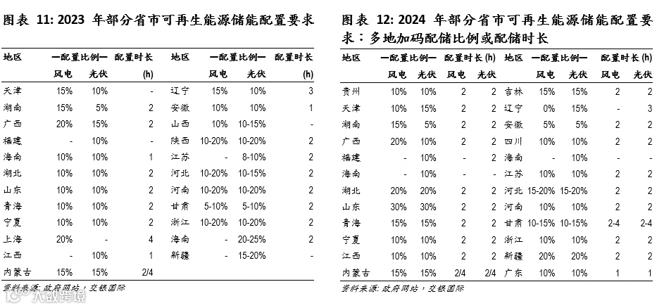 地方层面,各省市相继要求新能源发电项目上网需按一定功率配比配置储能。我们对比内地各省份2024年和2023年新能源配储要求,看到多数省份在配储比例或配储时长要求上加码,比如湖北、山东、江西、江苏、河北、青海等。此外,目前已有多个省份(包括甘肃、福建、湖北、吉林、辽宁、黑龙江、安徽等)明确要求电源侧配储的调峰时长超过4个小时。