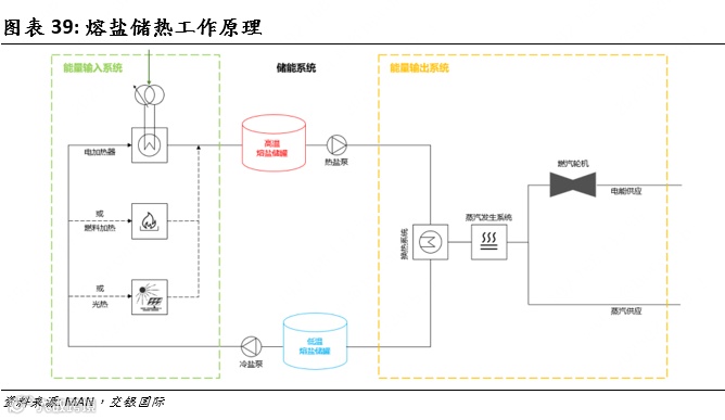 熔盐储热(储能)技术是一种先进的热能储存系统。其核心原理是将热能储存在高温熔化的盐溶液中,以供后续转化为电力或热。在充电阶段,电加热器使用外部电力产生热能用以加热盐溶液,将其升温至高温状态(可达600摄氏度)。在放电阶段,高温的熔盐通过热交换器将热能传递给流体介质(通常是高温油)。该介质随后被用于产生高温高压蒸汽,以驱动汽轮机来生产电力。同时,冷却的熔盐则被泵回冷盐储罐,准备好参与到下次储能过程当中。一个熔盐储热项目的关键部分包括冷/热盐储罐、电加热器、换热器以及配套的汽轮机等组件。