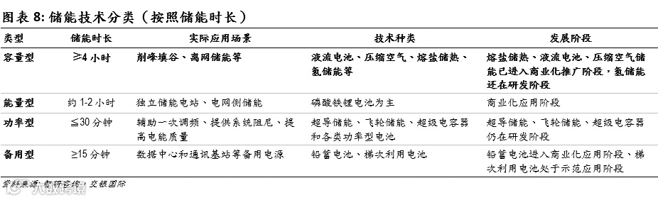 按照储能时长需求的不同,储能的应用场景可分为:容量型(≥4小时)、能量型(约1-2小时)、功率型(≦30分钟)和备用型(≥15分钟)。不同类型的储能适用不同的新能源发电场景。备用型储能解决新能源发电的随机性问题;功率型储能解决新能源发电的波动性问题从而实现电网频率稳定;容量型长时储能解决新能源发电的间歇性问题。