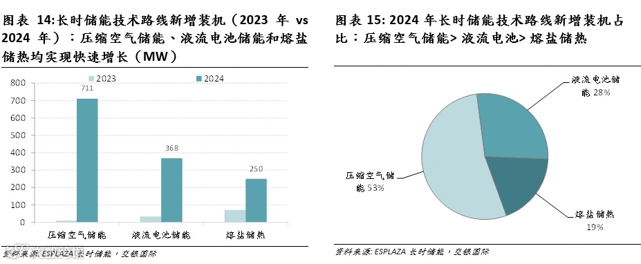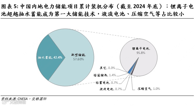 锂离子电池仍是主流,但其局限性及长时储能需求增长推动其他技术路径加速商业化。新型储能中,2024年,以磷酸铁锂为代表的锂离子电池储能累计装机占整体新型储能的96%,占整体储能的55%,已经超越抽水蓄能成为第一大储能技术。然而,锂离子电池的安全性不足,且其本身并不适用于长时储能。随着对长时、大容量储能需求的提升,我们预计,其它新型储能技术如液流电池、压缩空气储能、熔盐储热等将加速商业化应用。