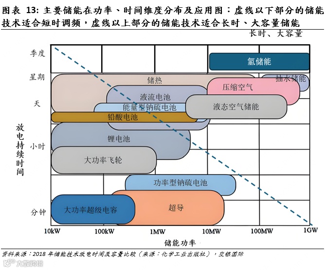 不同的储能技术适用的应用场景也不同。根据储能技术在功率、时间维度分布及应用(图表13),氢储能、抽水蓄能、压缩空气储能、熔盐储热以及液流电池,是适合长时大容量储能的五大技术。综合考虑技术成熟度和成本等因素: