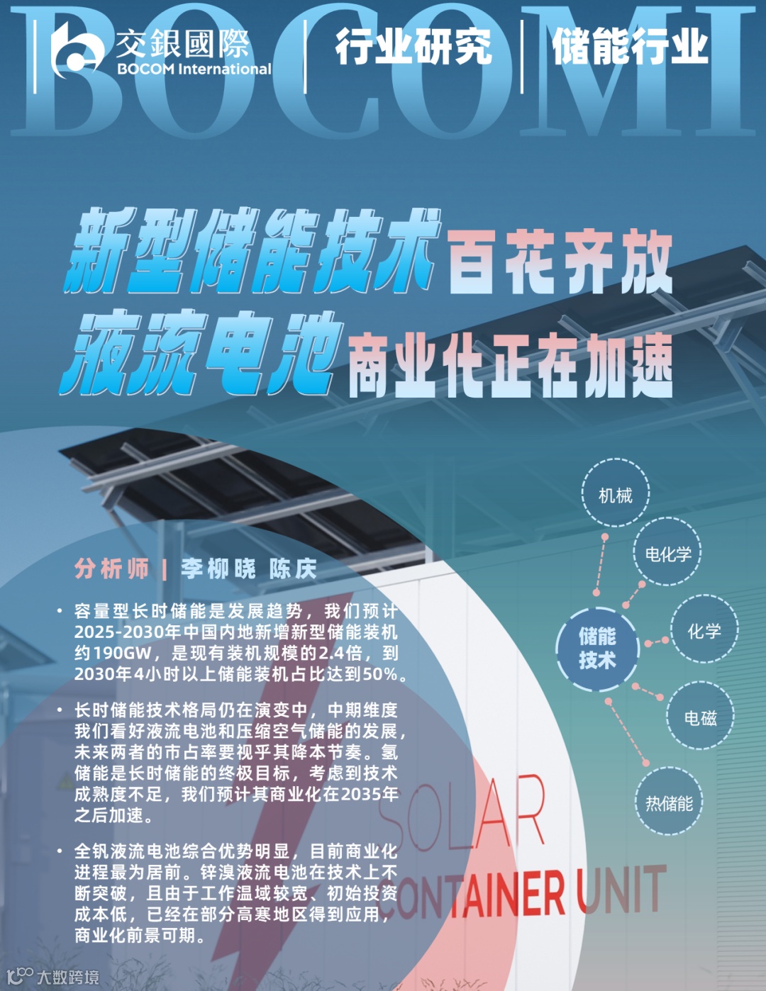 本文节选自交银国际已发布研究报告《新型储能技术百花齐放,液流电池商业化正在加速》。