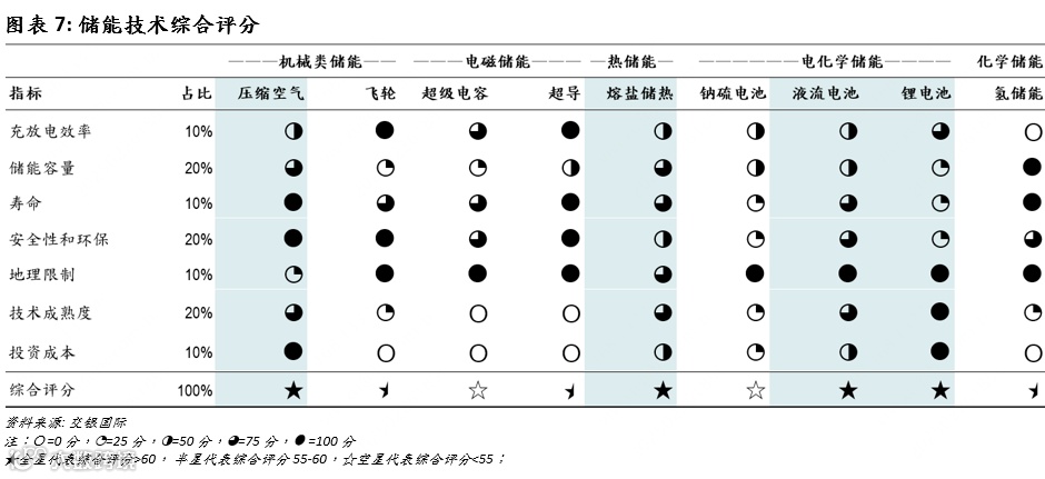本文中,我们对比分析了五大各具特色的技术路径性能,并综合考虑储能容量、安全性、成本等因素,尝试对各类储能技术的关键指标进行量化,并根据评分划分为三大梯队。