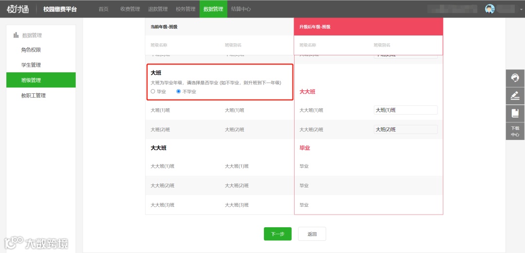 ①“升级前年级-班级”选择了“毕业”,则“升级后年级-班级”的“班级名称和班级别名”处显示“毕业”