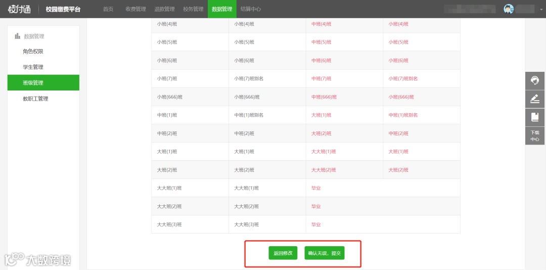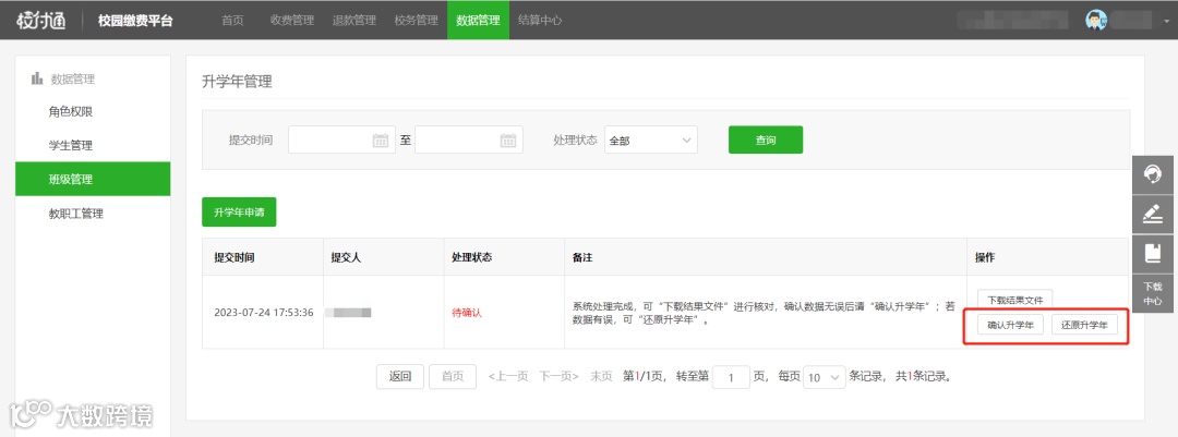 确认提交后,系统会自动进入数据处理阶段。系统处理完成后,学校管理员可在:班级管理-升学年管理-下载结果文件核对升学年数据,核对数据后确认升学年操作
