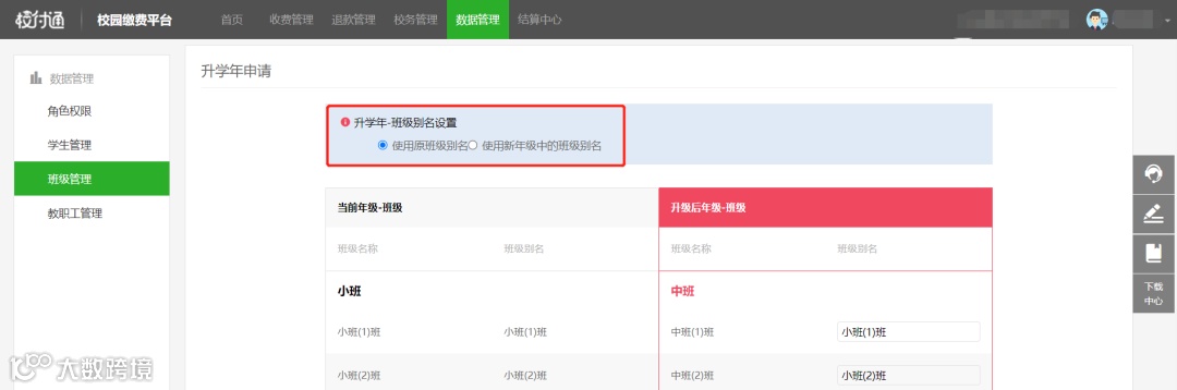 ②点选使用新年级中的班级别名,学校可根据需求编辑班级别名,升学年成功后,班级使用新年级中的班级别名