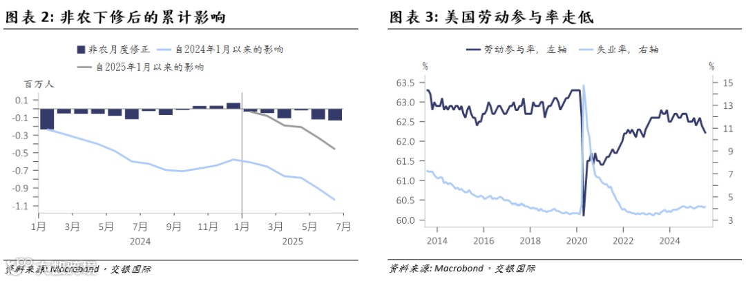 同上一年9月类似,就业市场下行风险推动美联储降息。7月,非农新增就业数据不及预期,且此前两月数据遭遇数十年来最大的下修。尽管从就业数据上来看,7月非农数据似乎仍尚可,且失业率维持在低位。但由于持续下滑的就业调查回复率,及劳工局模型误差的影响,当前的就业数据可能存在大幅被高估的风险。同时,失业率维持在低位主要可能受供给因素推动,即移民减少等因素使得更多人退出劳动力市场,使得劳动参与率持续走低。如果劳动参与率维持在年初左右的水平,当前的失业率可能更高,而当前的就业调查指标也指向更高的失业率水平。因此,就业市场数据高估等因素使得美联储数据依赖的政策路径更具挑战性,也是鲍威尔转鸽的主要因素,而并非出自于白宫的压力。