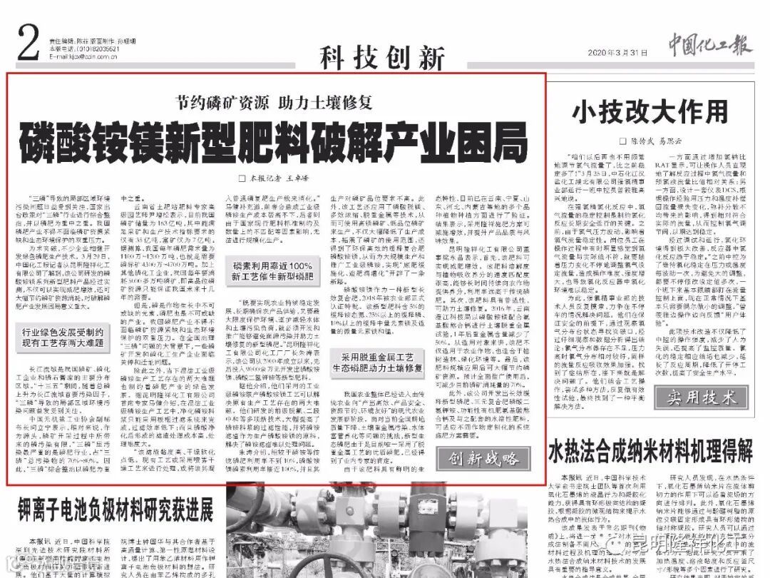 朱涛介绍,相较于磷铵等传统磷肥利用率不到10%,磷酸铵镁磷素利用率接近100%,并且其生产对磷矿品位要求不高。此外,该工艺还应用了磷酸脱镁、多效浓缩、脱重金属等技术,从而可使用高镁磷矿、低品位磷矿来生产,不仅大幅降低了生产成本,拓展了磷矿的使用范围,还得到了环保高效的缓释复合肥磷酸铵镁,从而为大规模生产和推广工业级磷铵,实现“底肥缓施化、追肥滴灌化”开辟了一条新路。