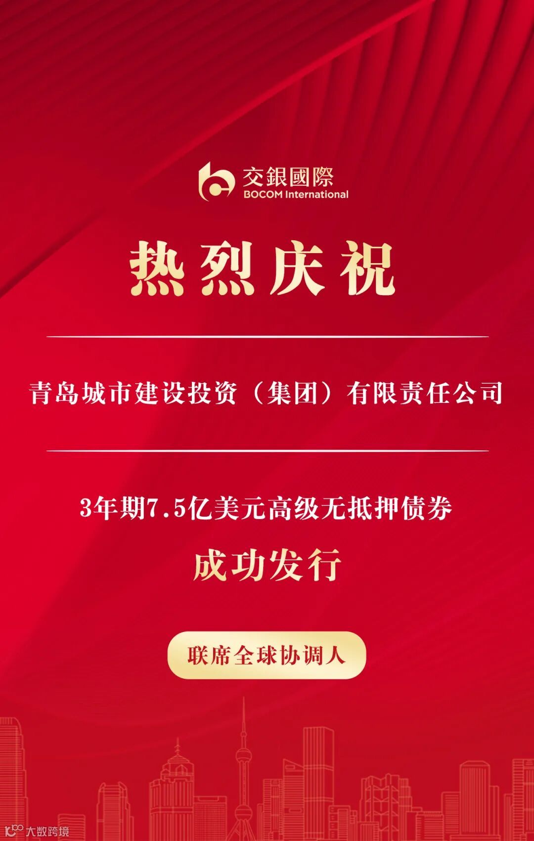 4月1日,交银国际作为联席全球协调人助力青岛城市建设投资(集团)有限责任公司(“青岛城投集团”)成功发行3年期7.5亿美元高级无抵押债券,创2023年以来可比地方国企最大融资规模,创青岛城投集团境外债券历史最大账簿规模。