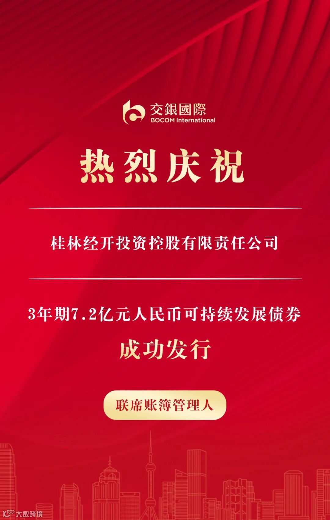2月27日,交银国际作为联席账簿管理人助力桂林经开投资控股有限责任公司(“桂林经开”)成功发行3年期7.2亿元人民币可持续发展债券,桂林银行提供备用信用证增信,发行收益率4.5%。