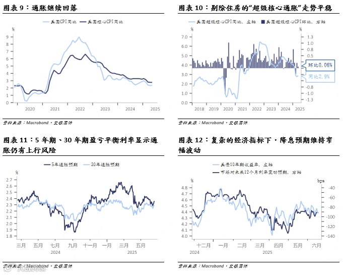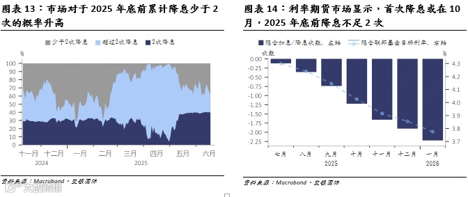 我们维持预计年底前降息次数为1-2次的判断,具体取决于经济收缩的程度和关税政策的实际影响。我们在下半年展望中指出,美元信用受损影响下,风险溢价持续上升,可能使得特朗普对外政策收敛,后续政策重心大概率将“由外向内”转换,从收缩性的关税政策向扩张性的财政政策倾斜,预计将显著降低经济下行风险 。若关税等贸易扰动显著放缓,且政策重心重回财政扩张,风险偏好回升的情况下,降息预期可能进一步收窄,甚至可能出现年内不降息的情形。