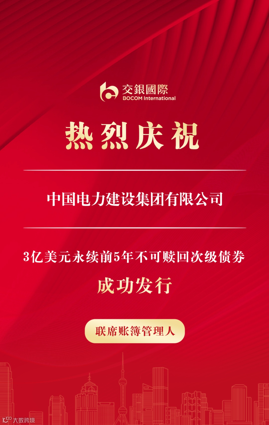 10月15日,交银国际作为联席账簿管理人助力中国电力建设集团有限公司(“中国电建”)成功发行3亿美元永续前5年不可赎回次级债券。中国电建于14日向市场宣布委任,于15日以初始价格指导5.05%区间向市场打开簿记,峰值认购超过5倍,最终发行收益率为4.65%,较初始价格指导大幅收窄40个基点,创中资美元永续债历史最低息差记录以及近两年中资企业最低永续债发行利率。