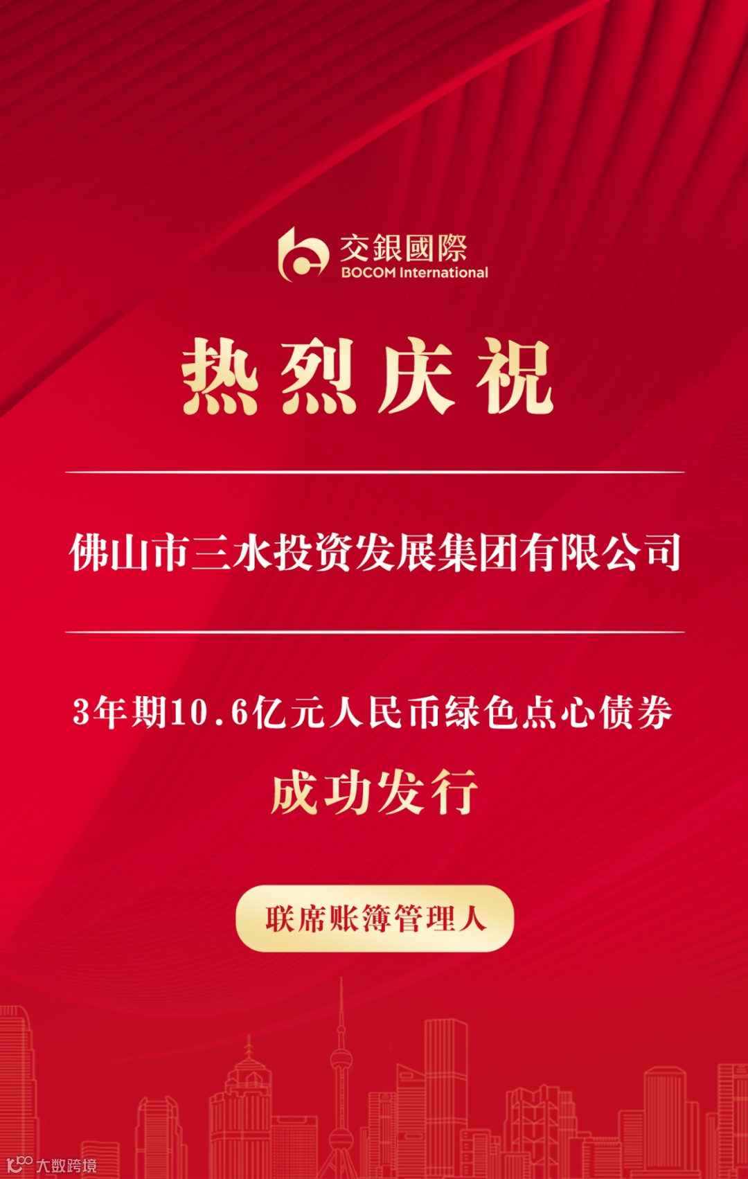 同日,交银国际作为联席账簿管理人助力佛山市三水投资发展集团有限公司(“佛山三水发展集团”)成功定价3年期10.6亿元人民币绿色点心债券,发行收益率为3.08%,创市场AA+评级地方国有企业直发离岸人民币债券票面利率新低。在坚实的基石订单支持下,发行人于15日以初始价格指导3.7%区间向市场打开簿记,获得投资者的积极认购,超募倍数达3.5倍,最终定价3.08%,较初始价格大幅收窄62个基点。