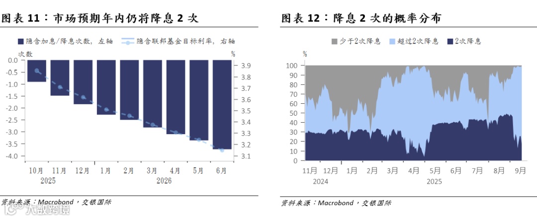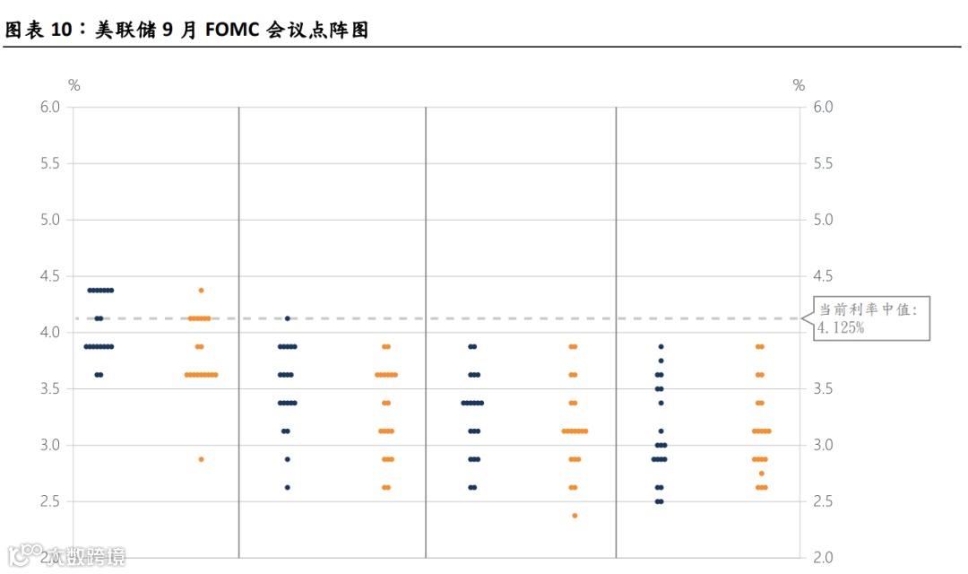 9月FOMC会议点阵图清晰地反映出美联储内部对后续政策路径仍存在较大分歧,政策的不确定性仍较高。虽然点阵图中位数显示年内仍存在两次降息,但在19位票委中,10位支持降息2次及以上,而9位票委支持2次以下,其中6位认为年内无需再降息。