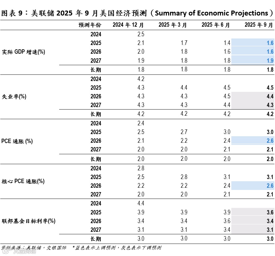 美联储2025年9月经济预测传递出乐观经济前景。最新预测摘要上调了美国2025年、2026年和2027年的GDP预测,同时下调了未来两年的失业率预期,仅略微上调了通胀预测。考虑到2026、2027年“大而美法案”带来的“宽财政”的预期,上调美国经济增速预测具有一定合理性,以及潜在的进一步降息都将为美国经济增长提供支撑,也意味着未来两年的降息空间可能相当有限。