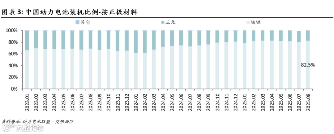 得益于厂家优惠政策陆续推出 (年款增配、调整车主权益等),叠加以旧换新政策,8月全国乘用车市场零售 199.5 万辆,同/环比+4.6%/+8.2%,创月度历史新高。受此影响,据中国汽车动力电池产业创新联盟数据,2025年8月中国内地动力电池装车量62.5GWh,同/环比+32.4%/+11.9%。其中,磷酸铁锂电池装车量同/环比+47.3%/+14.8%至51.6GWh,占比82.5%,仍维持在较高水平。8月中国电池出口维持稳健,当月合计出口22.6GWh,同/环比+23.9%/-2.6%,合计出口占当月销量16.8%。其中,动力电池出口量同/环比+35.7%/+1.9%至15.1GWh,占总出口量66.6%;其他电池出口量同/环比+5.6%/-10.4%至7.6GWh,占总出口量33.4%。