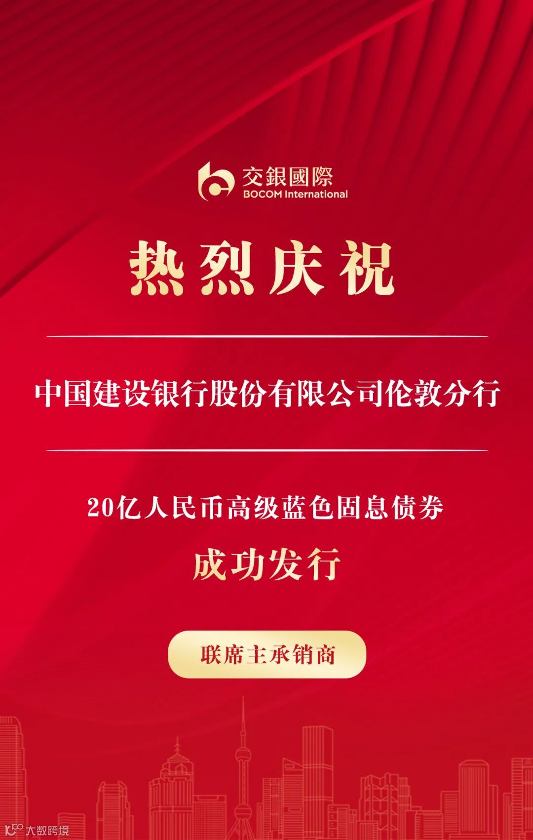 7月10日,交银国际作为联席主承销商助力中国建设银行股份有限公司香港分行和伦敦分行分别成功发行3年期10亿美元高级绿色浮息债券和3年期20亿人民币高级蓝色固息债券。香港分行美元浮息批次初始价格指导为SOFR+105bps区间,最终发行利差为SOFR+55bps,收窄50个基点,峰值订单超过24.8亿美元。伦敦分行人民币固息批次初始价格指导为3.35%区间,最终发行收益率2.83%,收窄52个基点,峰值订单超过55.4亿元人民币。