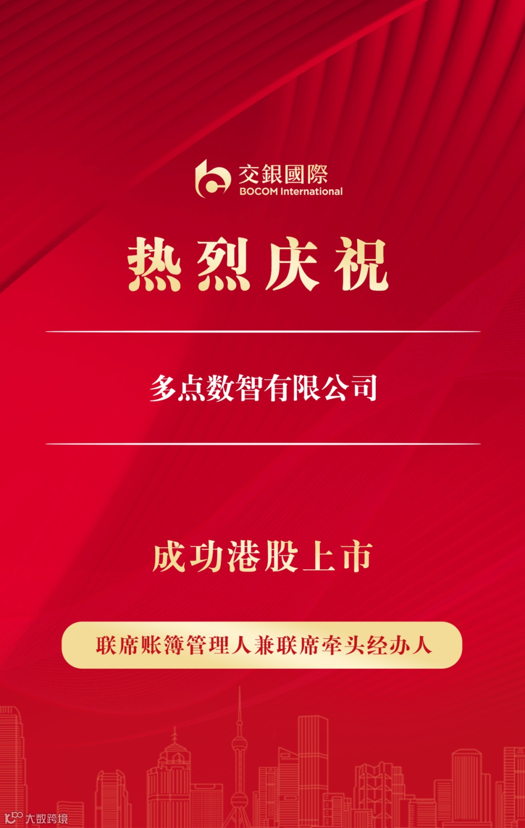 12月6日,多点数智有限公司(2586.HK)在香港联交所主板挂牌上市。多点数智本次全球发售定价每股30.21港元,发行25,774,000股,融资规模约7.79亿港元,国际配售获1.36倍覆盖,公开发售获1.94倍覆盖。交银国际担任联席账簿管理人兼联席牵头经办人,助力多点数智港股上市获得圆满成功。