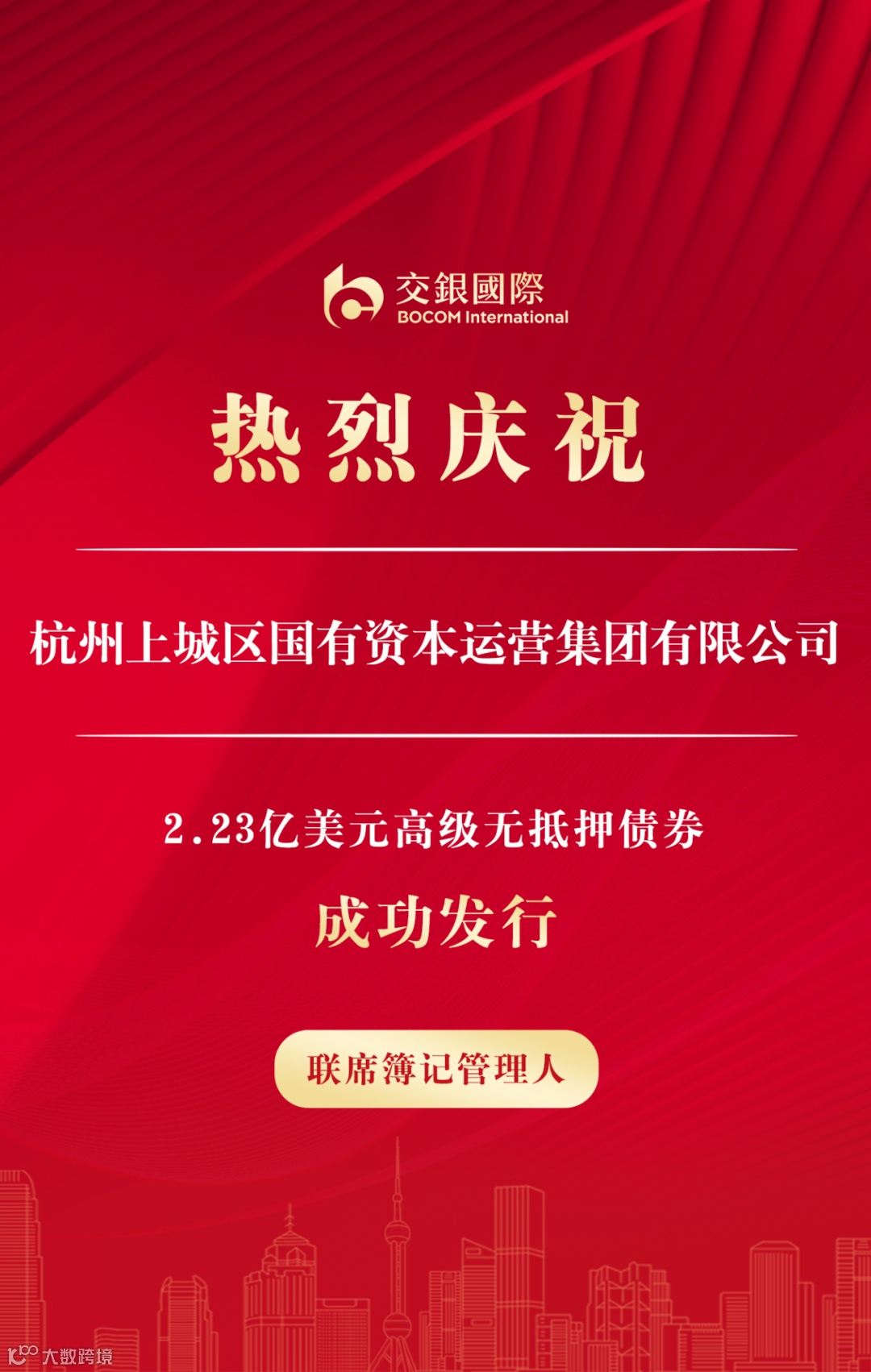 近期交银国际作为联席簿记管理人助力杭州上城区国有资本运营集团有限公司(杭州上城资本)成功发行2.23亿美元高级无抵押债券,票息6.70%。该笔债券向市场公布后,投资者认购较为踊跃,最终发行收益率较初始价格指导大幅收窄60个基点。本次发行是交银国际继2022年11月协助公司发行美元债以来,再次参与公司的境外债发行工作,双方进一步深化了银企关系。