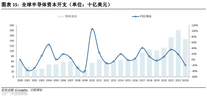 IC Insights 预计2023年全球半导体行业资本支出为1466亿美元,同比下降19.3%。经过了2021-22连续两年的快速提升,预计2023年全球半导体行业资本支出将会同比下降20%。虽然下游需求疲软是导致本次资本支出下行的直接因素,但是我们认为内地晶圆厂的扩产进度并未受到明显影响。同时我们判断国外芯片法案带来的巨量补贴将会带动2024年资本支出重回增长。