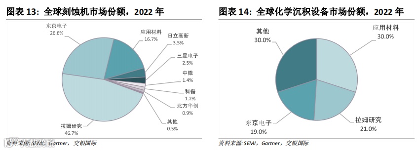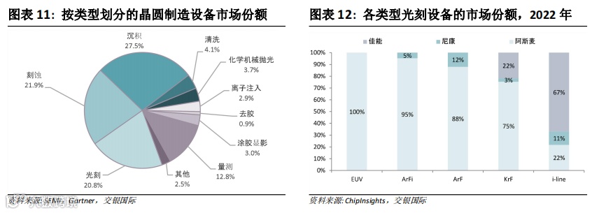具体分设备种类来看,光刻,刻蚀以及沉积这三类前道核心设备占到了半导体设备市场的70%,而这三类核心设备的市场份额基本掌握在美国,日本以及荷兰等国家企业手中。我们认为海外限制性措施的升级会进一步加快内地半导体设备自主可控能力的升级。