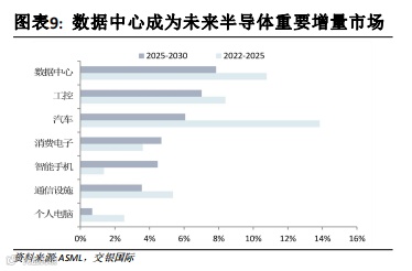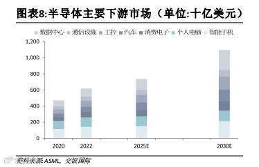 除了智能手机以外,个人电脑、消费电子、汽车、工控、通信设施以及数据中心也是半导体下游应用的重要市场。2022年ASML预测,2025年以前智能手机仍将是半导体下游最大的应用市场,但是到了2030年数据中心将会超过智能手机成为最大的半导体应用市场。分阶段来看,2022-25年复合增速最快的三大应用分别为汽车(+13.9%)、数据中心(+10.8%)、工控(+8.4%);而在2025-30年,复合增速最快的三大应用板块分别为数据中心(+7.9%)、工控(+7.0%)、汽车(+6.1%)。