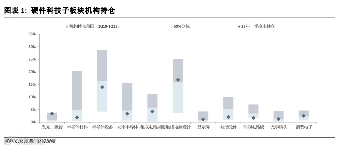 从各个子板块1季度业绩来看,只有半导体设备仍然保持着较为强劲的同比正增长,而其他板块的增速都在明显下降。从机构持仓也可以看到,传统的被动元件和印刷电路板等板块正处于历史低位,也说明市场对于硬件科技整体周期的判断仍处于下行趋势之中。