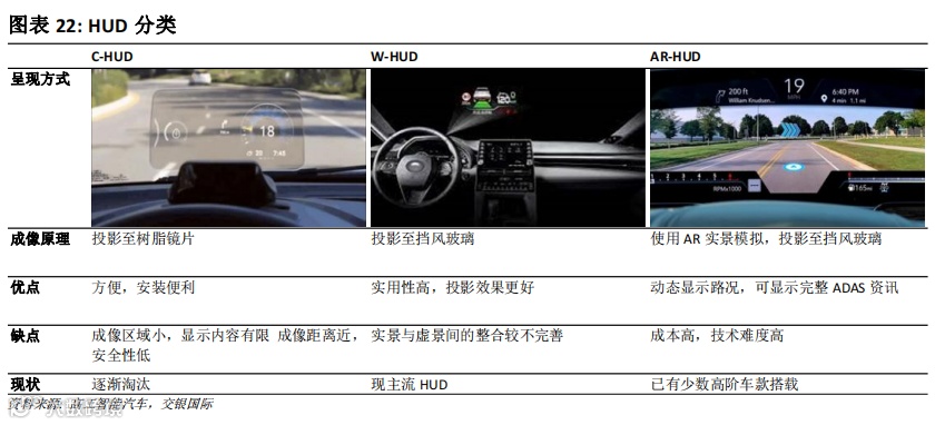 抬头显示(HUD)作为智能座舱具有代表性的功能之一,是重要的显示系统应用,已成为越来越多主机厂竞争的技术重点。根据成像方式不同,目前汽车行业HUD主要有3种产品形态,分别是C-HUD、W-HUD及AR-HUD。