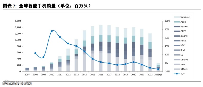 其次,如果我们观察2019年前半段(补库存阶段)的周期反弹,可以发现目前的半导体月度销售金额(3月:438.8亿美元)仍然远超此前补库存阶段的300-390亿美元水平,而下游市场的需求并不支持目前的销售规模。以半导体最大下游市场智能手机为例,2019-20年全球智能手机销量约为13.7-14.0亿只,接近历史最高水平,而2023年1季度销量仅为268百万只,远低于2019年1季度310百万只的销量水平,甚至低于全球疫情爆发的2020年1季度275百万只的水平。