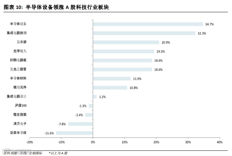 从2023年初至2023年6月8日,A股硬件科技多数子板块均跑赢A股及港股主要指数。其中涨跌幅靠前的子板块包括,半导体设备(+34.7%),集成电路封测(+32.3%),显示屏(+20.9%);而涨跌幅落后的子版块分别为功率半导体(-11.6%),消费电子(-7.8%),集成电路设计(+1.2%)。