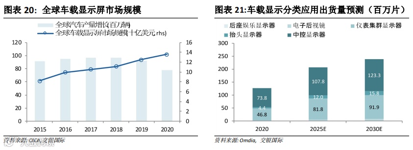 显示器已经成为座舱数字化转型的关键促成因素,智能座舱的普及将带动车载显示屏的需求。车载显示主要可分为中控显示、仪表显示、抬头显示、车载娱乐系统等。尽管汽车整体销量在过去几年已经开始走弱,但车用显示屏的需求却增长明显。根据Omdia统计数据,2020年全球汽车显示屏出货量达到1.27亿片,其中出货量最大的为中控显示屏,达到7380万片,电子仪表盘占比第二,出货量为4680万片。Omdia预测到2030年,车用显示屏市场年均复合增长为6.5%,其中增长最快的为电子后视镜(16.1%)和抬头显示器(13.5%)。