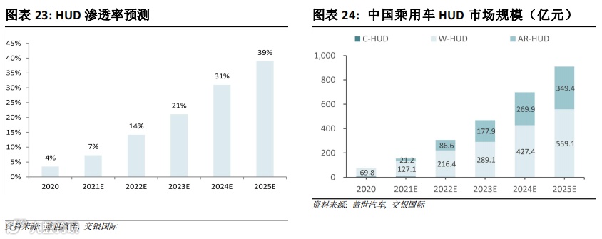 中国HUD市场空间广阔,目前渗透率仍然较低。2020年配套出货量累计达76.5万台套,渗透率不超过5%。在国产化降本效应下,2021年开始有更多本土主机厂车型开始配套HUD, 2022年开始HUD渗透率将会有更显著的提升。市场预计2025年中国乘用车HUD市场规模将有望提升至900亿元人民币,五年复合增长率高达64%。