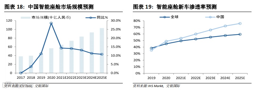 汽车的智能化正在重新定义人与车的关系,未来汽车将成为一个移动的智能空间。根据ICV Tank测算,中国智能座舱市场规模到2025年将超过1000亿元人民币,2020-25年复合增长率为12.7%。目前中国市场座舱智能配置水平的新车渗透率约为48.8%,IHS Markit预测到2025年可以超过75%,中国市场渗透率高于全球市场水平。