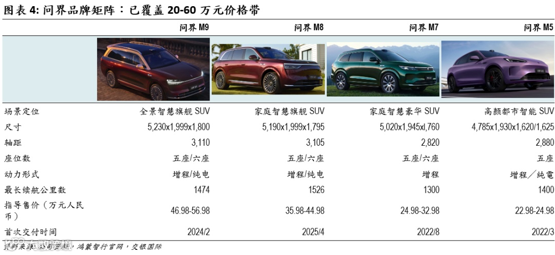 问界:定位高端(20–60万元)新能源乘用车,是公司当前最核心、增长最快的品牌。依托华为智选模式,在智能化水平上具备领先优势,代表车型包括M5、M7、M8与M9;