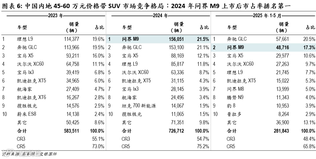 中国内地45-60 万元SUV市场,2024年问界M9市占率全国排名第一。问界M9处于45-60万元SUV细分市场,据易车网数据,2024年中位数价格处于该价格带的中国内地乘用车市场规模约为73万辆,CR3/CR5占55%/75%,市场集中度相对较高。45-60万元SUV细分市场车型销量大致可分为两个梯队: