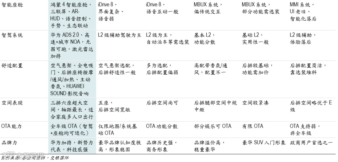 在华为强大技术支持下,问界系列车型从智能座舱到高阶智驾系统,实现全方位的软硬件协同创新,成功实现高端化突破。以问界M9车型为例,其售价区间46.98万-56.98万元,在高端SUV市场中直面来自德系豪华品牌“三强” (奔驰、宝马、奥迪,“BBA”)的传统竞争者。长期由BBA主导的这一市场,供给有限且竞争格局固化,消费者选择相对单一。而M9则提供了丰富的高端配置,如AR-HUD、三联屏、全车电吸门、激光雷达和全景音响系统等,这些在进口豪车上往往需要额外加价选配。鸿蒙4智能座舱的搭载,更为用户带来流畅的操作体验和完善的生态系统支持,实现多设备无缝联动和智慧语音交互,全面超越传统豪华车型的智能座舱体验。在智能驾驶方面,M9搭载的华为ADS系统,支持高速和城市NOA驾驶辅助,且不依赖高精地图,能够快速适应各种实际驾驶环境,表现优于多数进口车型。同等价格区间内,奥迪A6L、奔驰E级、宝马X5等车型虽久负盛名,但问界M9凭借卓越的智能科技和全面均衡的产品力,自上市以来,便不断挑战这些传统豪强的市场份额,强势改写中国内地市场高端SUV市场的竞争格局。