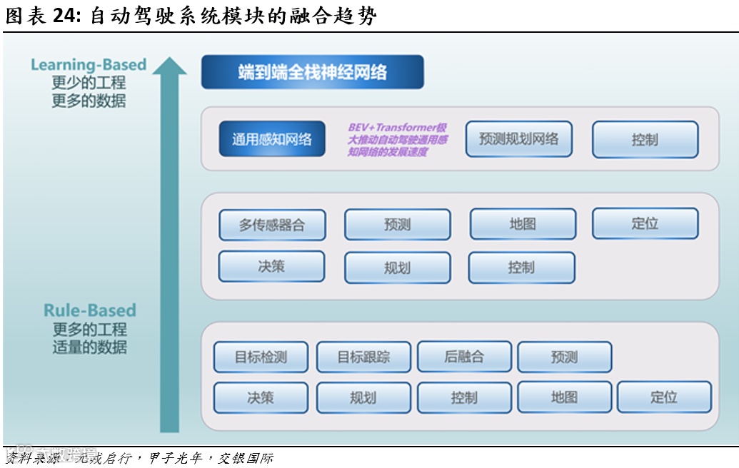 自特斯拉2023年8月发布FSD V12以来,我国厂商迅速跟上,鸿蒙智行、小鹏、理想、商汤绝影等头部车企和辅助驾驶供应商纷纷投入端到端研发,并在后续的近半年时间陆续对外披露上车量产规划。2024年4月,华为推出采用端到端架构的华为乾崑ADS 3,ADS 3去掉了BEV网络,通过GOD大网实现了从“识别障碍物”到“场景理解”的跨越,不仅能识别白名单目标和异形障碍物,还能感知道路结构和场景理解。相较于百度及大多数车企,华为ADS 3采用自研的MDC 810芯片,真正实现自主可控。技术层面,我们认为大多整车厂会由之前传统的神经网络+规则算法(基于规则)转向感知端大模型(基于学习)。