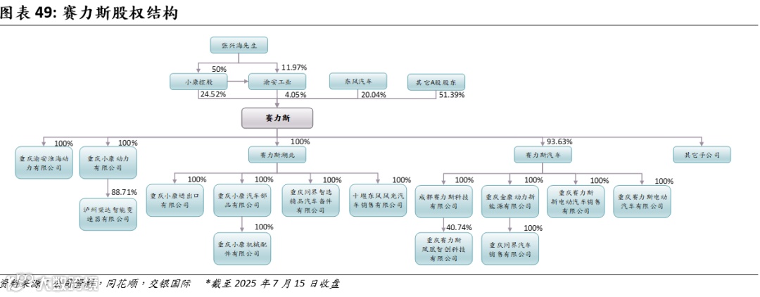 赛力斯股权结构较为集中。实控人张兴海先生为公司创始人,通过小康控股与渝安汽车工业间接持有公司13.07%的股份,此外,其亲属张兴礼、张兴民、颜敏等亦持有公司股权,家族合计控股约30%。公司第二大股东为东风汽车集团,持股20.04%,由国资委100%控股。2024年9月,公司发布《发行股份购买资产报告书(草案)》的公告,通过发行股份的方式购买重庆产业母基金、两江投资集团、两江产业集团所持有的龙盛新能源100%股权(即问界两江超级工厂),股权变更完成后,三家重庆国资合计持7.56%的公司股权。