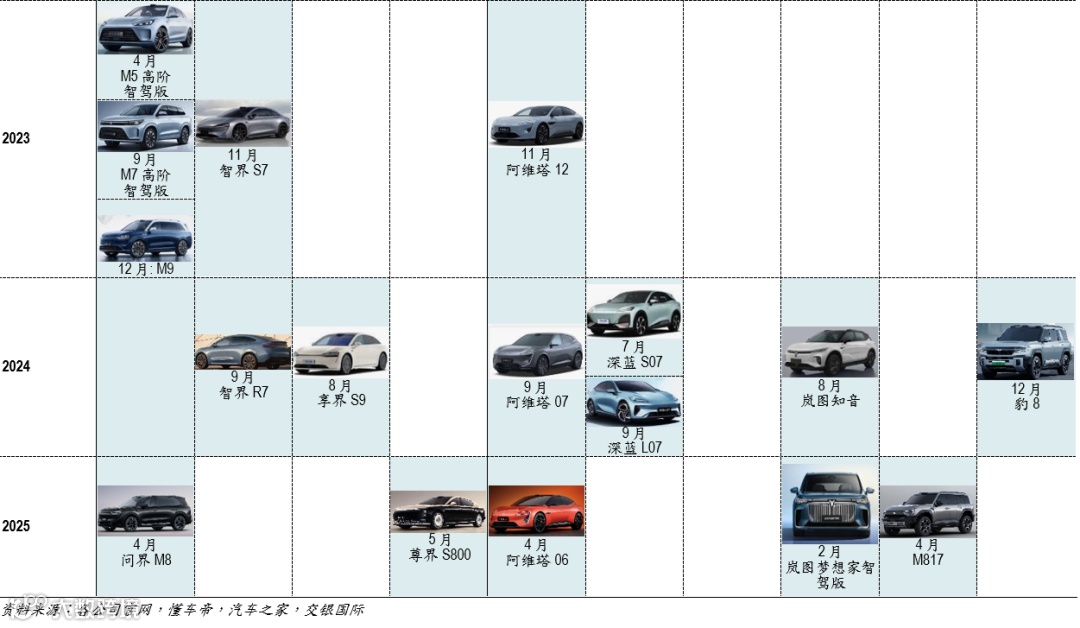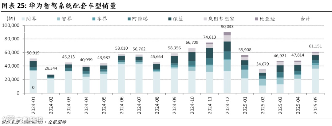华为智驾领先行业,入股引望加强华为属性和智能化水平。华为在智能座舱和智能驾驶方面的产品迭代正在加速,目前已更新至HarmonyOS 5和ADS 4,智能驾驶水平在业内处于第一梯队。从目前趋势看,我们认为大多整车厂会由之前传统的神经网络+规则算法(基于规则)转向感知端大模型(基于学习)。大模型的研发需要车企持续的研发投入,在保证端到端大模型“正循环”的情况下,销量领先、数据规模领跑的车企具备更大数据存储量。华为ADS已经搭载于问界M5/M7/M9、阿维塔11/12、智界S7等车型,随着华为合作车企规模不断扩大,华为品牌赋能下合作车企销量提升,华为有望在数据规模上领先于大多数车企。问界深度合作华为,2024年入股引望,进一步强化属性,有望依托华为的品牌力和智能化水平继续维持领先优势。