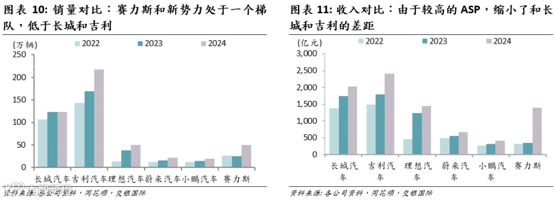 ASP:理想与蔚来牢牢占据高端市场, ASP层面维持第一梯队,2024年分别为29万元和30万元,赛力斯借助问界M9等高端产品,2024年ASP大幅跃升至28万元,和理想和蔚来接近。小鹏相对较低,2024年ASP为21万元。吉利与长城的ASP在2024年分别为11/16万元,典型的走量型传统车企,未来提升ASP依赖新能源高端子品牌(如极氪、魏牌)的放量。综合销量和ASP,2024年五家公司的收入排名为:吉利和长城>理想和赛力斯>蔚来和小鹏。