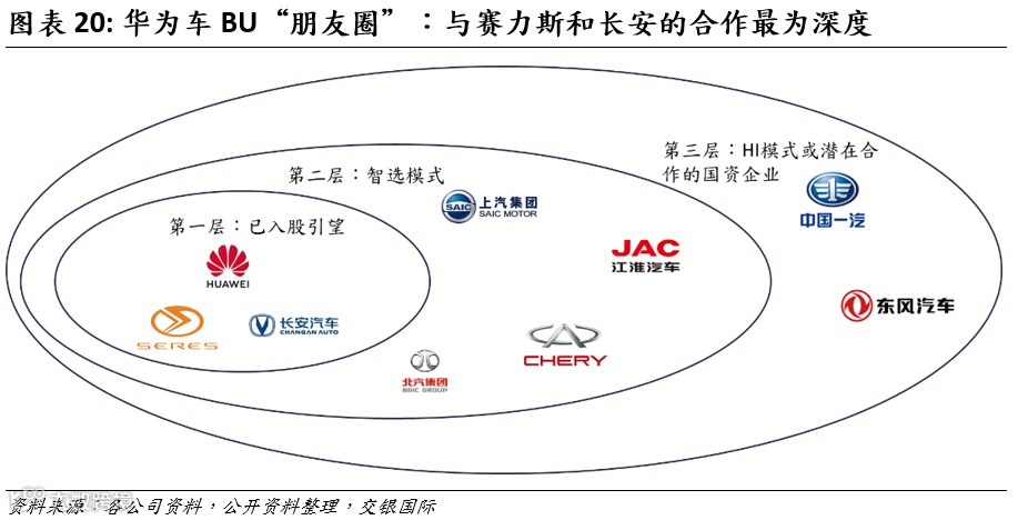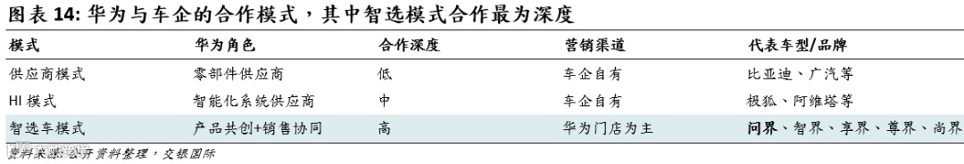 2019年,华为正式成立了智能汽车解决方案BU(车BU),该部门最初隶属于ICT业务板块。华为始终恪守不造车的原则,通过“供应商、HI(Huawei Inside)和智选车”三种模式与汽车厂商开展合作。在智选车模式下,华为与汽车企业在品牌塑造、研发创新以及渠道拓展等方面进行全面协同合作。华为深度参与到车型的设计与开发过程中,并提供高强度的智能化技术支持和渠道助力。主要的合作伙伴包括问界(赛力斯)、享界(北汽)、智界(奇瑞)、尊界(江淮)以及尚界(上汽)等品牌。
