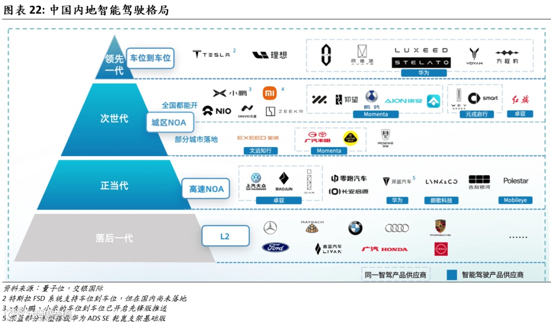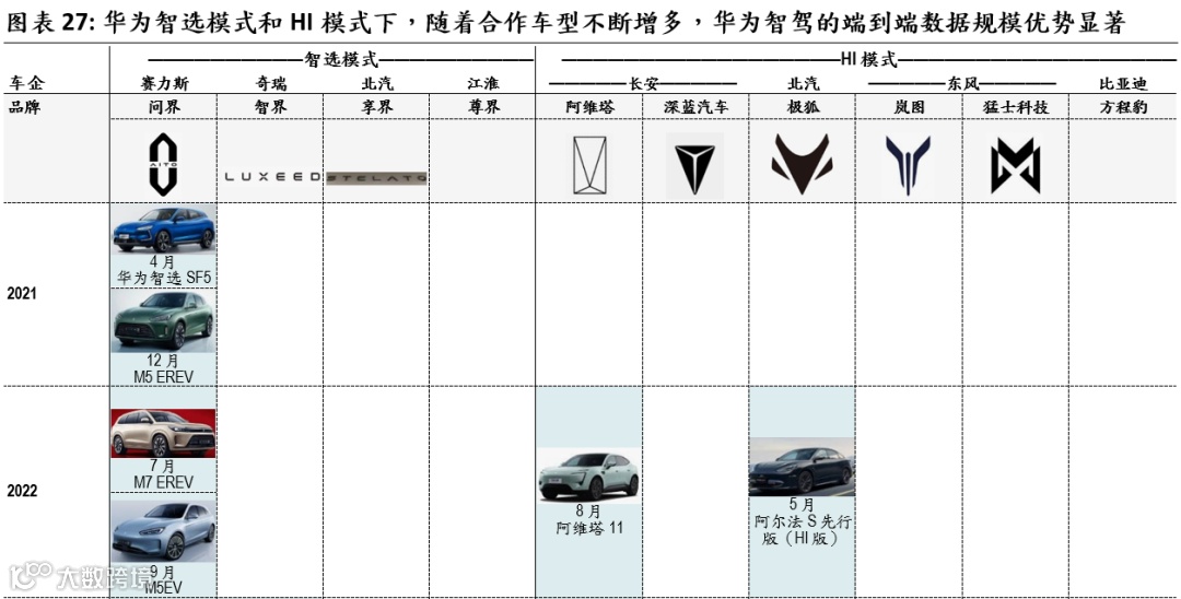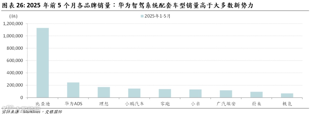 和同类产品比较,我们认为华为的智驾产品在端到端路线具备领先优势,主要体现在以下方面:华为智驾系统已搭载多款车型,随着搭载车型及销量不断增加,华为智驾在端到端模型研发上具备数据规模优势。基于华为的品牌影响和智驾系统的技术优势,华为已经与多家国资汽车集团签订合作协议。长安是华为最早的合作对象,其后北汽、江淮、奇瑞、赛力斯、上汽与华为采取智选合作模式;2024年2月,东风加入华为的HI合作模式。华为ADS智驾系统已经搭载于问界M5/M7/M9/M8、智界S7/R7、享界S9、阿维塔07/11/12、深蓝L07/S07、岚图梦想家、比亚迪豹8车型,以上车型于2025年前5个月的销量约24.6万辆,已经超过大多数新势力车企。大模型的研发需要车企持续的研发投入,在保证端到端大模型“正循环”的情况下,销量领先、数据规模领跑的车企具备更大数据存储量。我们认为,随着合作车企规模不断扩大,华为品牌赋能下合作车企销量提升,华为有望在数据规模上领先于大多数车企。