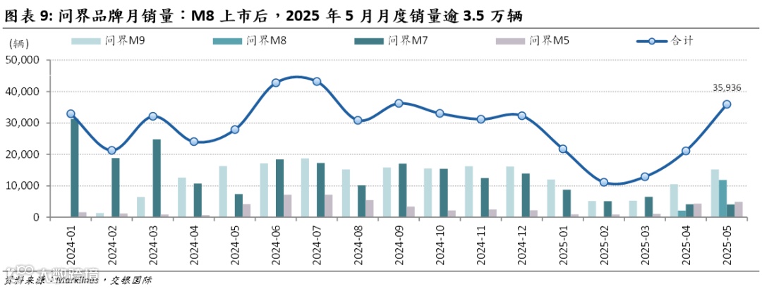 根据易车网数据,问界M8于2025年4月发布后,截至5月,该车型销量达13,999辆,在35-45万元SUV市场市占率3.6%。得益于问界M8的销售,2025年5月,问界品牌月度销量重回3.5万辆以上。
