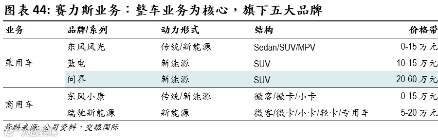 赛力斯的主营业务覆盖整车制造与汽车零部件两大板块,由不同业务主体分别负责,其中整车板块是公司业务重心。旗下的赛赛力斯汽车专注于与华为的深度协同,全面承担问界品牌车型的研发、制造与销售工作。目前,赛力斯集团旗下拥有问界、东风风光、东风小康、蓝电和瑞驰五大整车品牌,产品线涵盖高端智能新能源、传统燃油车、混合动力车型及轻型商用车等多个细分市场: