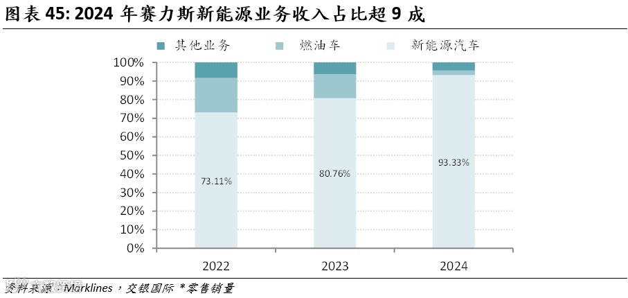 赛力斯的销量结构正由传统燃油车加速向新能源车转型,问界品牌已成为推动公司销量增长的核心动力。自2021年底问界品牌推出以来,新能源车型的销量占比快速攀升, 2024年公司新能源汽车营收已占总营收的93.3%,燃油车占比仅为2.37%,展现出强劲的增长势头。问界的高销量已初步形成品牌势能,随着后续新车型的陆续发布,预计问界将继续拉动整体销量增长,其在公司销售结构中的占比也有望进一步提升。