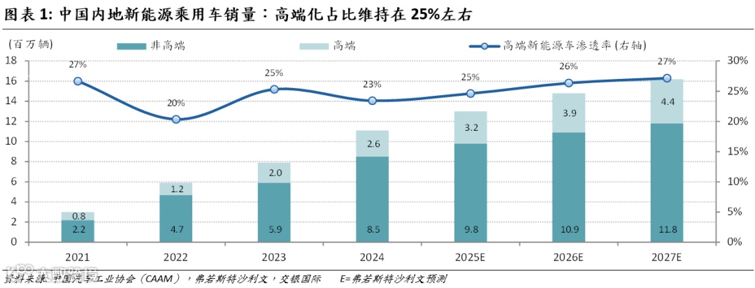 根据价格细分,我国乘用车市场可分为高端和非高端车型市场。随著消费者对电动化、高科技配置和智能化体验的需求增长,更多高端品牌正加速其新能源汽车车型的布局。高端新能源乘用车正逐步抢占传统豪华燃油车的市场占有率。据中国汽车工业协会和弗若斯特沙利文数据, 2024年中国内地高端新能源乘用车销量达到260万辆,占中国内地新能源乘用车市场总量的23.4%,并预计2025-27年中国内地高端新能源乘用车销量约320/390/440万辆,新能源乘用车高端化率提升至约25%/26%/27%。
