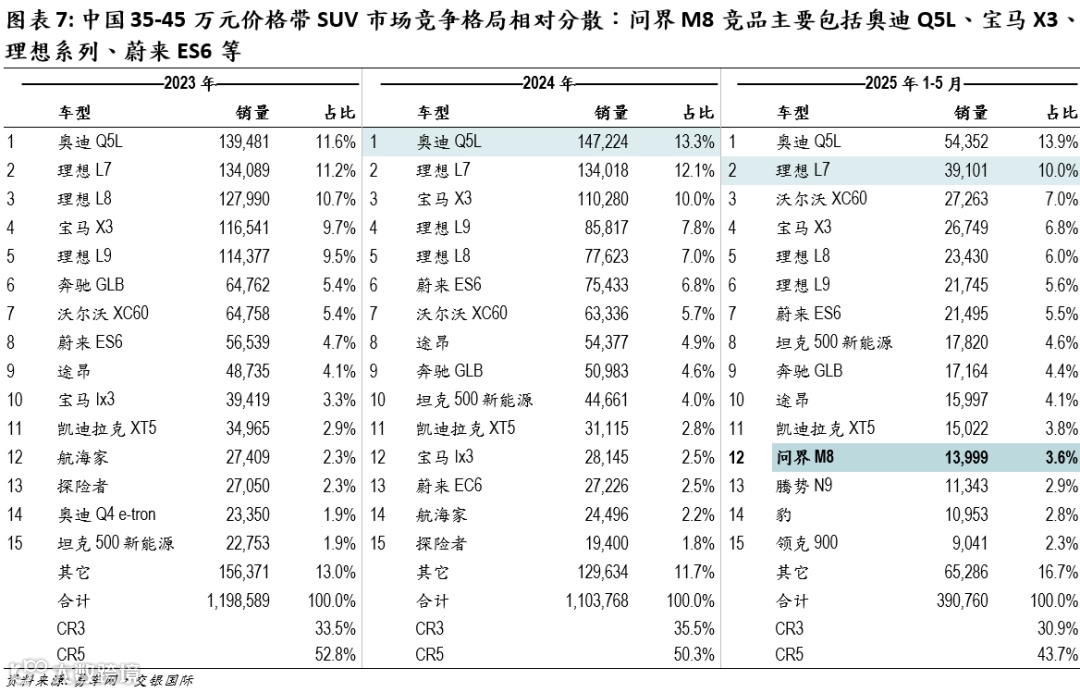 据易车网数据,2024年35-45 万元SUV市场整体市场规模约110万辆,该价格带市场供给车型差距不大,竞争格局呈“百花齐放”的状态,整体缺乏明显领先者,CR3/CR5为33%/47%。